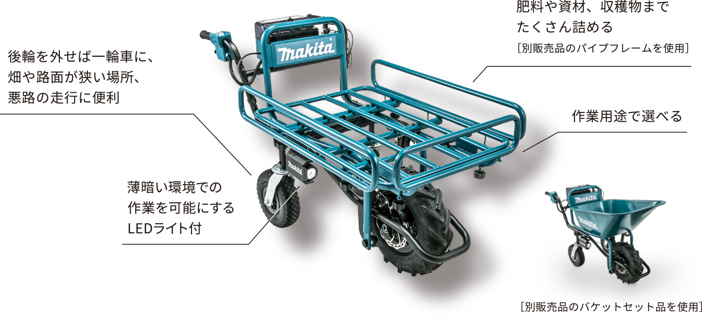 肥料や収穫物を運ぶツールを、手押しの一輪車からマキタの充電式運搬車に。